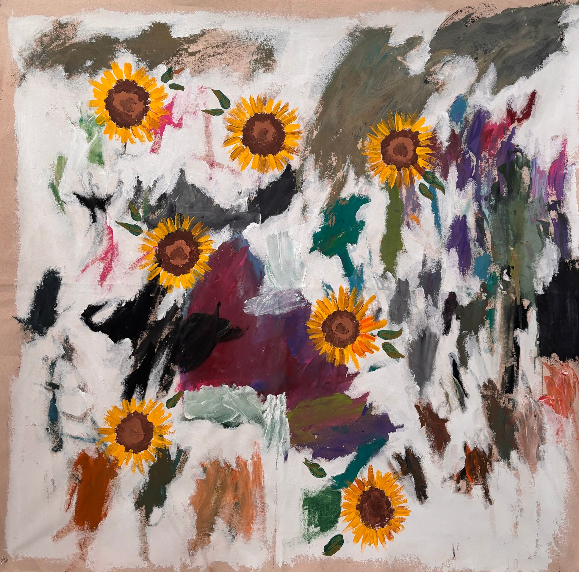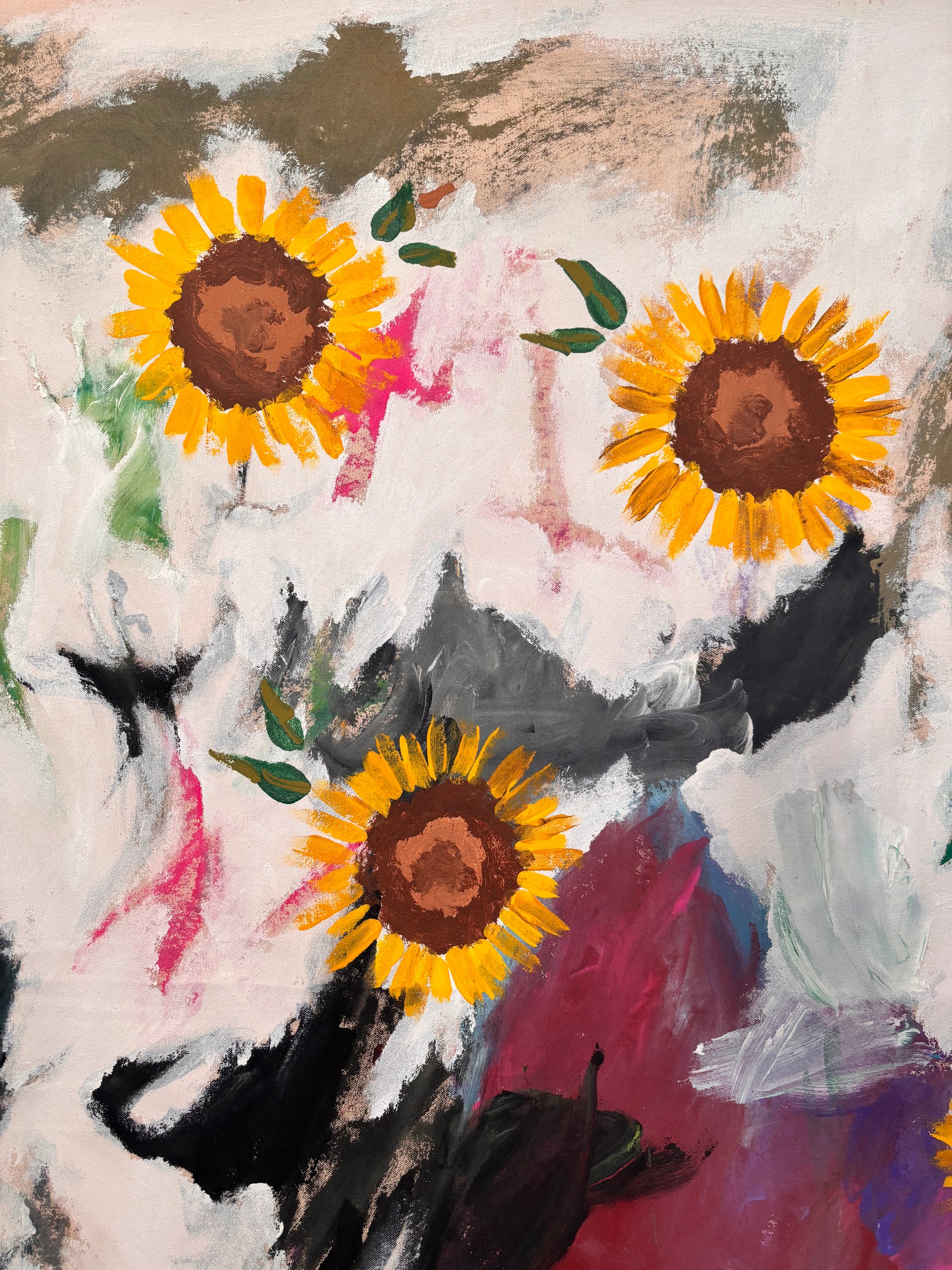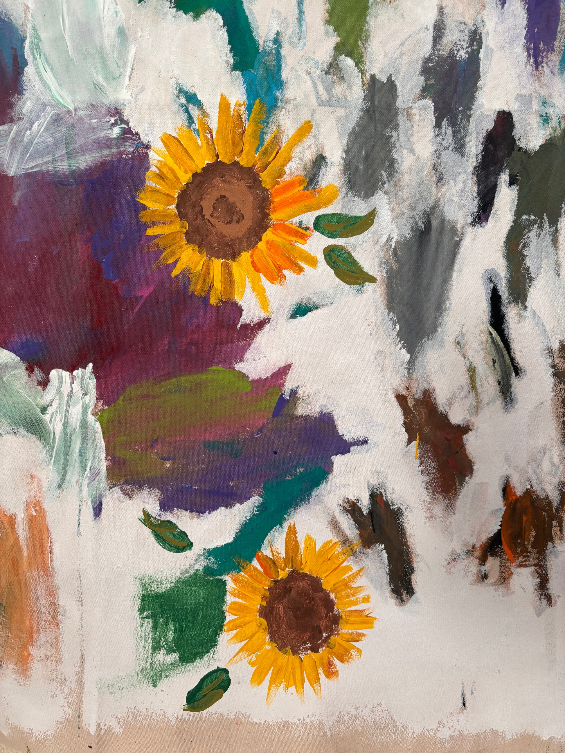 Background painted by 2 Art Masters: a 4 year old and 7 year old. Sunflowers painted by: Alex Hondo